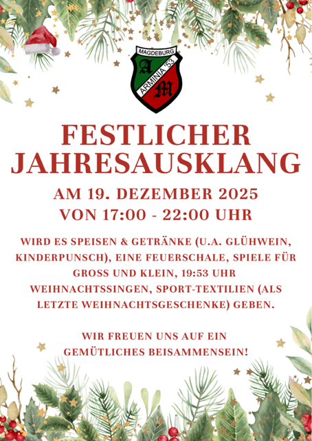 am Freitag den 19.12.25 von 17:00-22:00 Uhr möchten wir mit euch zusammen unseren festlichen Jahresausklang feiern.