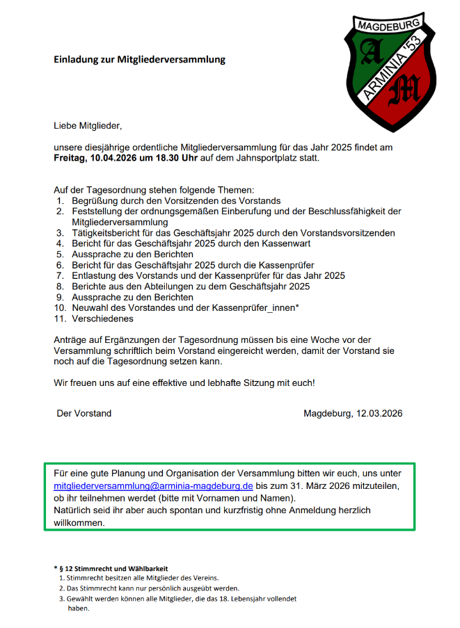 Liebe Mitglieder des SV Arminia ´53 Magdeburg e.V.,